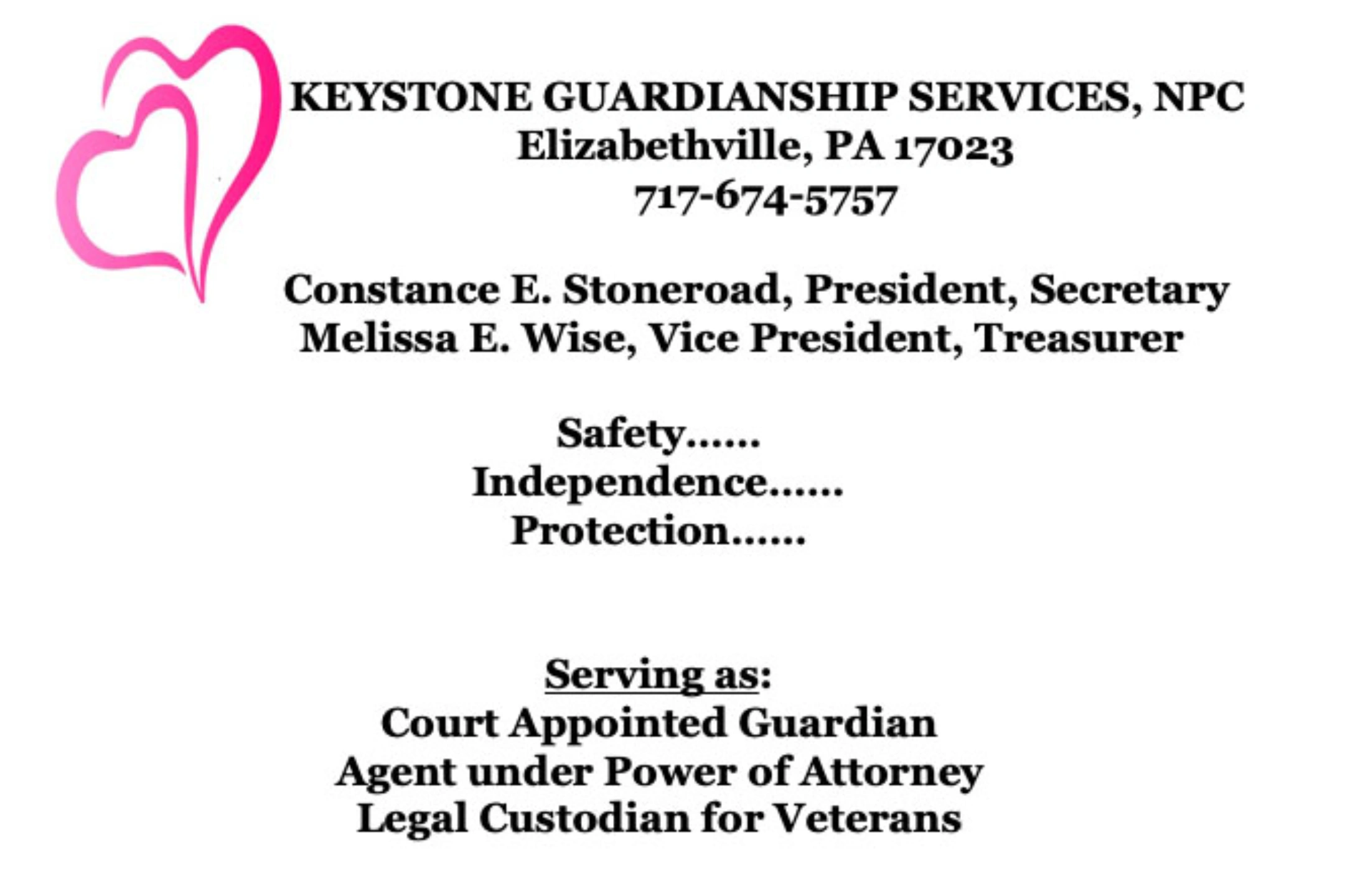 Keystone Guardianship Services was established as a partnership between Attorney Jeffrey Engle of Shaffer & Engle Law Offices and Constance E. Stoneroad. Keystone Guardianship Services incorporated in 2006 as a nonprofit business corporation and in 2011 Keystone Guardianship Services became a 501 (c) (3).